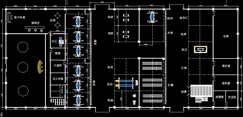 2010年1月15日,黃先生來到上海,我去浦東機場接待了他,我首先帶他看了幾家我在上海做過的修理廠,他看了表示不錯,第二天到公司了,他把實際的場地圖給我看了,我做了一份施工圖如下: