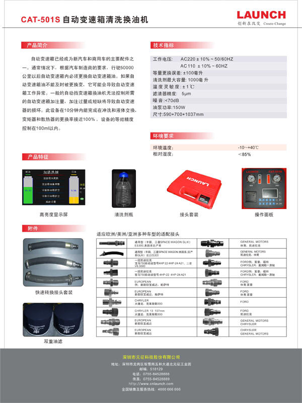 CAT-501S是一款利用(發(fā)動(dòng)機(jī)工作時(shí))自動(dòng)變速箱內(nèi)部壓力和設(shè)備泵的壓力差,同時(shí)進(jìn)行進(jìn)、排油工作的自動(dòng)變速箱清洗換油產(chǎn)品。具備自動(dòng)變速箱油更換,自動(dòng)變速箱(加清洗劑)循環(huán)清洗,進(jìn)、排油方向自動(dòng)識(shí)別,常用自動(dòng)變速箱保養(yǎng)車型自定義添加調(diào)用,自動(dòng)變速箱油更換結(jié)果(自定義項(xiàng)目)打印,油濾清洗更換提醒等功能。同時(shí),5英寸顯示界面,外加選配VGA外接顯示器功能,操作更直觀,宣傳更有力。