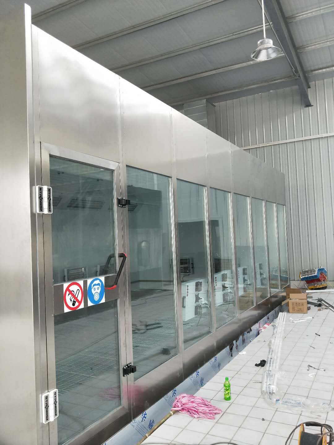 側(cè)置或后置排風(fēng),三面巖棉板,前面四扇不銹鋼黑鈦金落地玻璃大門,玻璃采用雙層中孔夾膠鋼化玻璃。外掛式烤燈(雙開門),配內(nèi)外斜1米地臺,305格柵14塊,不銹鋼圍板。配YDW系列11kw雙進(jìn)風(fēng)離心排風(fēng)機(jī)1臺,帶G4光氧和活性炭環(huán)保,加大集氣箱,延長耗材更換時間。